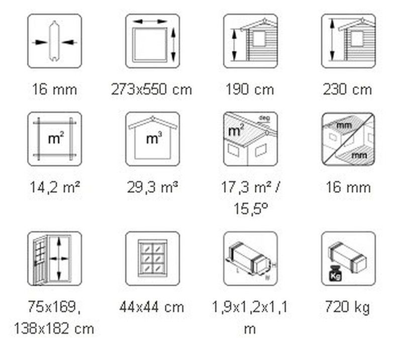 ESPECIFICAÇÕES DO PRODUTO: Medidas exteriores: 273 x 550 cm Altura da parede: 190 cm Volume: 29,3 m3 Porta / janela de vidro: plexiglas Janela fixa, medidas da passagem: 44 x 44 cm Porta, medidas da passagem: 75 x 169, 138 x 182 cm Tábuas do telhado: 16 mm Superfície do telhado: 17,3 m2 Inclinação do telhado: 15,5º Peso: 720 kg EM CASO DE ESCOLHA SEM TRATAMENTO RECOMENDAMOS: -Tinta verniz de base aquosa ou Lasur (que penetra profundamente na madeira permitindo madeira e não formando película). QUAL É O TRATAMENTO? Como temos nossos próprios banhos de tratamento para tratamento por imersão em marrom, cinza e transparente, cabines e outros itens maiores podem ser encomendados tratados com Axil 3000 P da Sarpap & Cecil Industries líquido de tratamento solúvel em água, garantindo tratamento nas classes 1-3. Além dos componentes de proteção da madeira contra danos biológicos e proteção contra radiação UV, este primer pode conter três pigmentos diferentes. O tratamento por imersão marrom e cinza pode realçar a cor da sua casa, mas o imersão transparente funciona para o estágio de preparação da pré-pintura. O pigmento desbota gradualmente com o tempo, mas isso não tem efeito negativo no desempenho do tratamento. ACESSÓRIOS OPCIONAIS: - 3 telas asfálticas - 6 embalagens de telhas asfálticas - 1 caixa de pregos (para a tela asfáltica ou telhas)