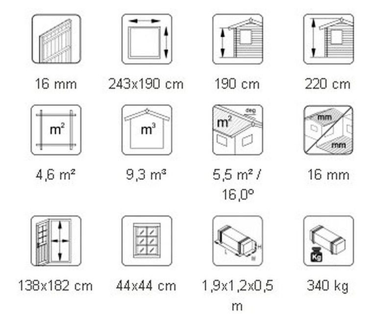 ESPECIFICAÇÕES DO PRODUTO: Medidas externas: 243 x 190 cm Altura da parede: 190 cm Volume: 9,3 m3 Porta / janela de vidro: plexiglas Janela fixa, medidas de passagem: 44 x 44 cm Porta, medidas de passagem: 138 x 182 cm telhado: 16 mm Superfície do telhado: 5,5 m2 Inclinação do telhado: 16,0º Peso: 340 kg EM CASO DE ESCOLHA SEM TRATAMENTO RECOMENDAMOS: -Tinta verniz de base aquosa ou tinta Lasur (que penetra profundamente na madeira, permitindo que a madeira respire e não formando um filme). QUAL É O TRATAMENTO? Como temos nossos próprios banhos de tratamento para tratamento por imersão em marrom, cinza e transparente, cabines e outros itens maiores podem ser encomendados tratados com Axil 3000 P da Sarpap & Cecil Industries líquido de tratamento solúvel em água, garantindo tratamento nas classes 1-3. Além dos componentes de proteção da madeira contra danos biológicos e proteção contra radiação UV, este primer pode conter três pigmentos diferentes. O tratamento por imersão marrom e cinza pode realçar a cor da sua casa, mas o imersão transparente funciona para o estágio de preparação da pré-pintura. O pigmento desbota gradualmente com o tempo, mas isso não tem efeito negativo no desempenho do tratamento. COMPLEMENTOS OPCIONAIS: - 1 rolo de tela asfáltica - 3 embalagens telha asfáltica - 1 caixa de pregos (para a tela ou telhas asfálticas) Peso e medidas da embalagem: 1 embalagem de 1,9 x 1,18 x 0,59m e 336Kg