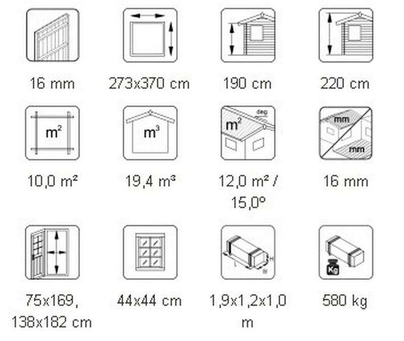 ESPECIFICAÇÕES DO PRODUTO: Medidas externas: 273 x 370 cm Altura da parede: 190 cm Volume: 19,4 m3 Porta / janela de vidro: Plexiglas Janela fixa, medidas da passagem: 44 x 44 cm Porta, medidas da passagem: 75 x 169, 138 x 182 cm Tábuas: 16 mm Superfície do tejadilho: 12,0 m2 Inclinação do tejadilho: 15,0º Peso: 500 kg A CASO DE ESCOLHA SEM TRATAMENTO Aconselhamos: -Tinta verniz à base de água ou tinta Lasur (que penetra profundamente na madeira, deixando a madeira e não formando película). QUAL É O TRATAMENTO? Como temos nossos próprios banhos de tratamento para tratamento por imersão em marrom, cinza e transparente, cabines e outros itens maiores podem ser encomendados tratados com Axil 3000 P da Sarpap & Cecil Industries líquido de tratamento solúvel em água, garantindo tratamento nas classes 1-3. Além dos componentes de proteção da madeira contra danos biológicos e proteção contra radiação UV, este primer pode conter três pigmentos diferentes. O tratamento por imersão marrom e cinza pode realçar a cor da sua casa, mas o imersão transparente funciona para o estágio de preparação da pré-pintura. O pigmento desbota gradualmente com o tempo, mas isso não tem efeito negativo no desempenho do tratamento. ACESSÓRIOS OPCIONAIS: - 2 rolos de tela asfáltica - 5 embalagens de telha asfáltica - 1 caixa de pregos (para a tela ou telha asfáltica)