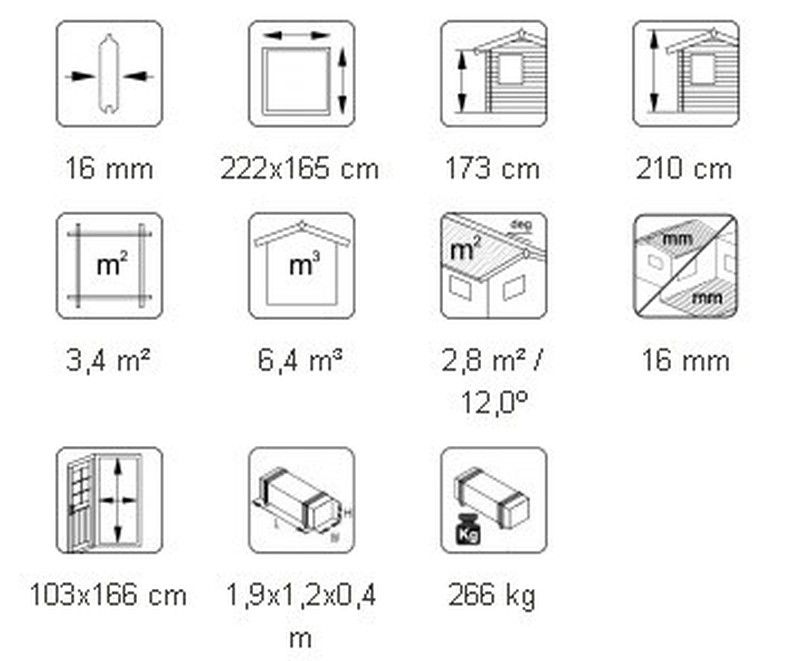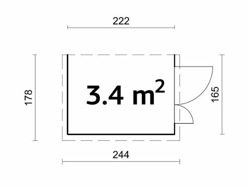 ESPECIFICAÇÕES DO PRODUTO: parte traseira NÃO INCLUI Medidas externas: 222 x 165 cm Altura da parede: 173 cm Volume: 6,4 m3 Tipo de porta / janela: --- Porta / janela de vidro: --- Medidas da porta, passagem: 103 x 1666 cm Largura da porta: --- Tábuas do telhado: 16 mm Superfície do telhado: 2,8 m2 Inclinação do telhado: 12,0º Peso: 266 kg Aconselhamos EM CASO DE ESCOLHA SEM TRATAMENTO: -Tinta verniz à base de água ou Lasur (penetra profundamente na madeira permitindo que a madeira respire e não forme uma película). QUAL É O TRATAMENTO? Como temos nossos próprios banhos de tratamento para tratamento por imersão em marrom, cinza e transparente, cabines e outros itens maiores podem ser encomendados tratados com Axil 3000 P da Sarpap & Cecil Industries líquido de tratamento solúvel em água, garantindo tratamento nas classes 1-3. Além dos componentes de proteção da madeira contra danos biológicos e proteção contra radiação UV, este primer pode conter três pigmentos diferentes. O tratamento por imersão marrom e cinza pode realçar a cor da sua casa, mas o imersão transparente funciona para o estágio de preparação da pré-pintura. O pigmento desbota gradualmente com o tempo, mas isso não tem efeito negativo no desempenho do tratamento. ACESSÓRIOS OPCIONAIS: - 1 rolo de pano asfáltico - 1 caixa de pregos (para pano ou telhas asfálticas)