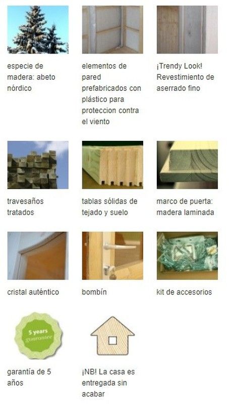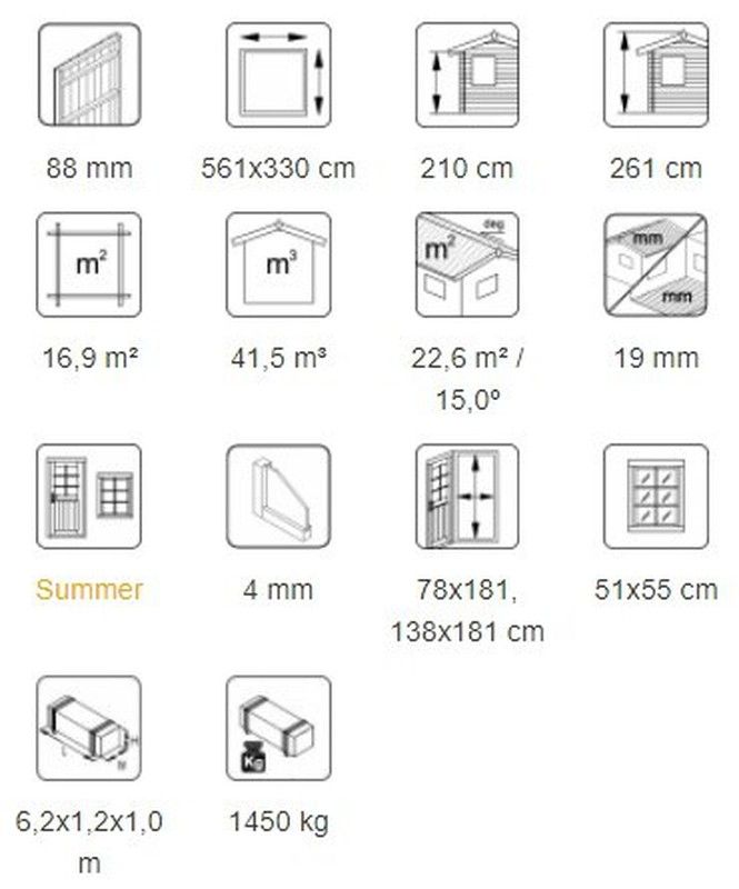 ESPECIFICAÇÕES DO PRODUTO: parte traseira INCLUI Medidas exteriores: 561 x 330 cm Altura da parede: 210 cm Volume: 41,5 m3 Tipo de porta / janela: Verão Porta / janela de vidro: vidro verdadeiro, porta de 4 mm, medidas de passagem: 78 x 181, 138 x 181 cm Guarnição da porta: baixa, tábuas do telhado de madeira: 19 mm Superfície do telhado: 22,6 m2 Inclinação do telhado: 15,0º Peso: 1450 kg RECOMENDAMOS: -Tinta verniz à base de água ou Lasur (que penetra profundamente no a madeira permitindo que a madeira respire e não formando uma película). ACESSÓRIOS OPCIONAIS: - 5 rolos de tela asfáltica - 8 embalagens de telha asfáltica - 1 caixa de pregos (para a tela ou telhas asfálticas) - Tubo de drenagem 106629 + 106630