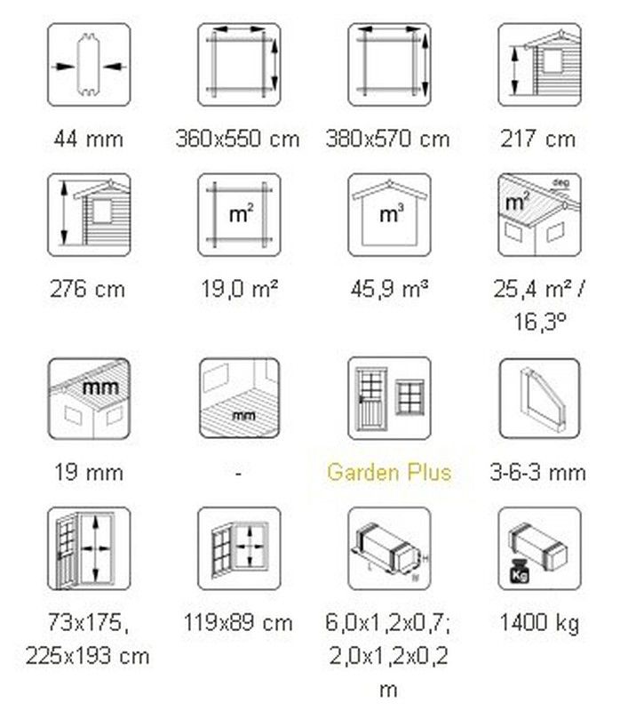 ESPECIFICAÇÕES DO PRODUTO: Dimensões externas: 380 x 570 cm Altura da parede: 217 cm Volume: 45,9 m3 Tipo de janela / porta: Jardim + Porta / janela de vidro: vidro duplo, janela 3-6-3 mm, tamanho da passagem: 119 x 89 cm Porta, degraus: 74 X 175 cm Porta da garagem: madeira 225 x 194 cm Tábuas do telhado: 19 mm Superfície do telhado: 25,4 m2 Inclinação do telhado: 16,3º Peso: 1300 kg Aconselhamos EM CASO DE ESCOLHA SEM TRATAMENTO : -Tinta verniz de base aquosa ou tinta Lasur (que penetra profundamente na madeira, deixando a madeira respirar e não formando película). QUAL É O TRATAMENTO? Como temos nossos próprios banhos de tratamento para tratamento por imersão em marrom, cinza e transparente, cabines e outros itens maiores podem ser encomendados tratados com Axil 3000 P da Sarpap & Cecil Industries líquido de tratamento solúvel em água, garantindo tratamento nas classes 1-3. Além dos componentes de proteção da madeira contra danos biológicos e proteção contra radiação UV, este primer pode conter três pigmentos diferentes. O tratamento por imersão marrom e cinza pode realçar a cor da sua casa, mas o imersão transparente funciona para o estágio de preparação da pré-pintura. O pigmento desbota gradualmente com o tempo, mas isso não tem efeito negativo no desempenho do tratamento. COMPLEMENTOS: - 6 embalagens de tela asfáltica - 10 embalagens de telha asfáltica - 1 caixa de pregos (para a tela ou telhas asfálticas) - Tubo de drenagem QVVRviil6 - Arrecadação lateral - Calhas laterais - Plantadeira 120 cm - Parede interna LAZZW44-3857-1