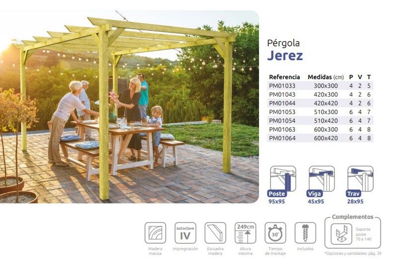 Pm01054 jerez 4x5 4 metros de profundidade (travessas) 5 metros de largura (vigas) posts: 6 unidades 95 x 95 x 2400 mm vigas: 4 unidades 45 x 95 x 2550 mm crossbars: 8 unidades 28 x 95 x 4200 mm suportes: 8 unidades 45 x 95 x 450 mmPérgula de madeira maciça JEREZ com tratamento Autoclave A4 + Parafusos INCLUÍDOS: 6X3 metros (feixesXtravesaños)