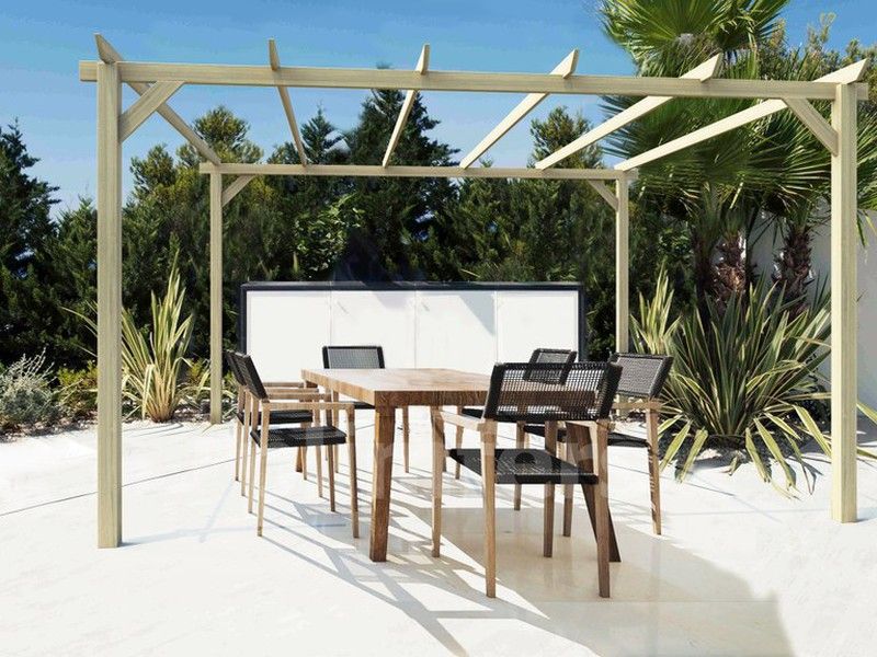 Pm01033 postes jerez 3x3: 4 unidades 95 x 95 x 2400 mm vigas: 2 unidades 45 x 95 x 3000 mm vigas: 5 unidades 28 x 95 x 3000 mm suportes: 4 unidades 45 x 95 x 450 mmPérgula de madeira maciça JEREZ com tratamento Autoclave A4 + Parafusos INCLUÍDOS: 3X4