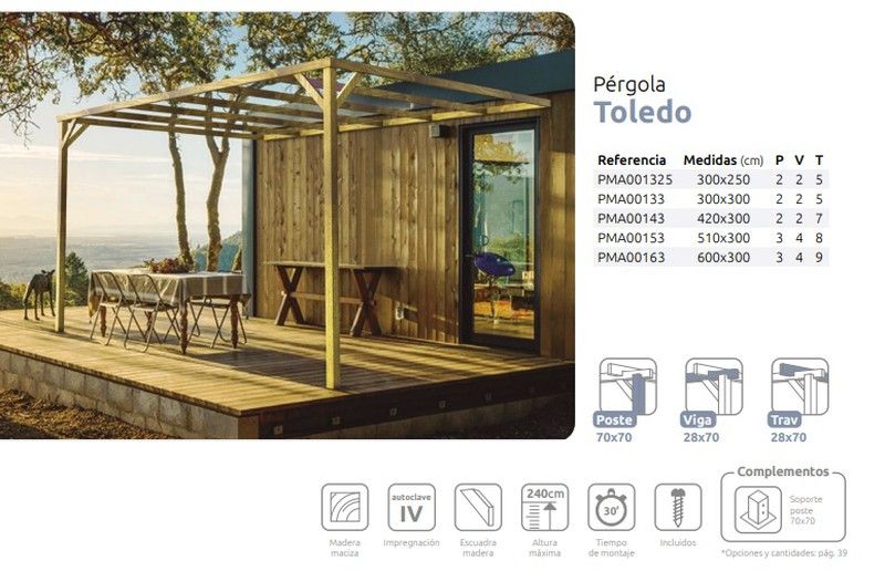 Toledo pérgula fixada em madeira maciça com madeira tratada a4 madeira de pinho nórdico altura máxima 240 cm hardware incluído. Não inclui acessórios como tolhos, tecido, etc ... Tamanhos disponíveis: - 300x250 cm 72 kg - 300x420 cm 100 kg - 510x300 cm 107 kg - 600x300 cm 150 kg descrição: postes: 70 x 70 mm vigas: 28 x 70 mm barras transversais : 28 x 70 mm estas pérgulas incluem tratamento em autoclave nível a4 na cor verde, o que significa que não necessitam de nenhum tipo de tratamento extra nos primeiros anos de vida. Fique ao ar livre em contato direto com o solo ou água doce. Entrega em 48 - 72 horas ancoras opcionais